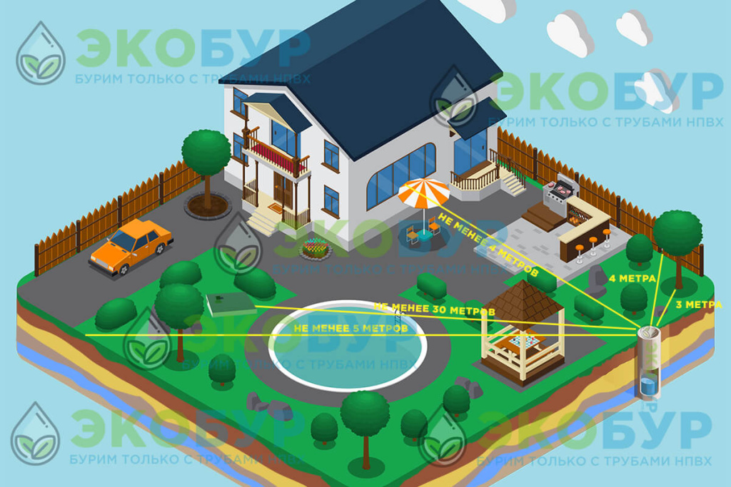 Санитарные правила определяют минимальные расстояния между скважиной, септиком, колодцам и зданием дома. Эти нормы защищают пользователя и увеличивают срок службы оборудования.